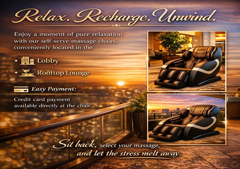 Enjoy a moment of pure relaxation with our self-serve massage chairs, conveniently located in the Lobby and the Rooftop Lounge. Perfect after a long day of travel or sightseeing.